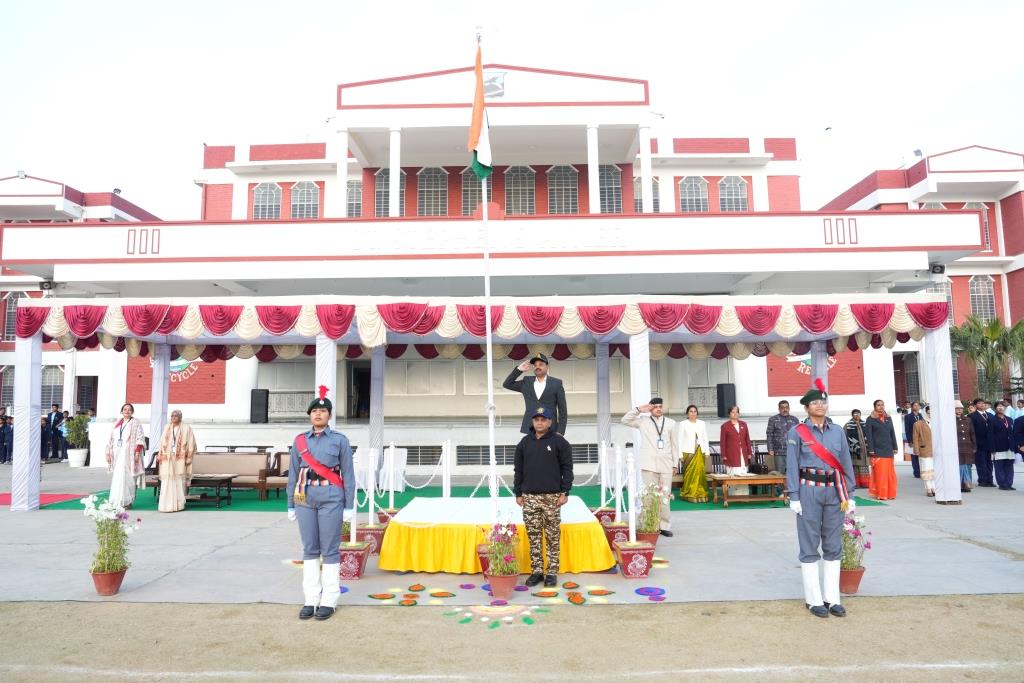 The celebrations commenced with the unfurling of the National Flag by the Chief Guest, Mr. Rajeev Kajot, Deputy Registrar, Cooperative Societies, Ajmer. This was followed by an impressive ceremonial march past led by the school’s NCC cadets, Scouts and Guides, along with the platoons of the four Houses. Marching in perfect synchrony to the rhythmic beats of the school band, they showcased discipline, unity, and national pride.